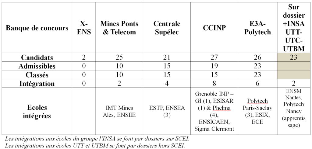 Quelques exemples : CentraleSupélec, Arts et Métiers, SupOptique, ENSTA Bretagne, Bordeaux INP, ENSIIE Evry, écoles INSA, ESTP, jusqu’au réseaux Polytech, FESIC, Avenir, Puissance Alpha. La cible principale de nos élèves est le concours CCINP.